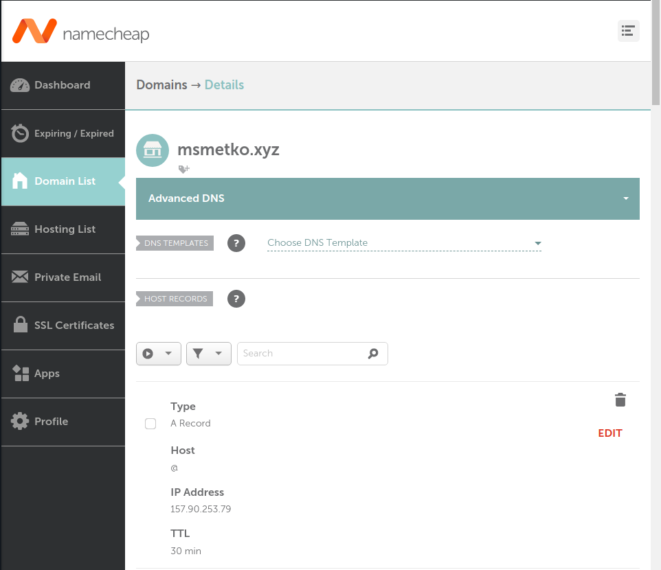Just buying the domain name won’t magically make the internet send the traffic to the server instance. You must create a mapping that says “msmetko.xyz points to 157.90.253.79”. This mapping is called and A-record. The A-records are managed in Namecheap domain settings. When you change these settings, Namecheap propagates them to the entirety of Internet (although asynchonously). DNS servers learn about a particular msmetko.xyz ata certain IP adress, so the next time someone tries to visit that domain, they can answer with a correct IP address.